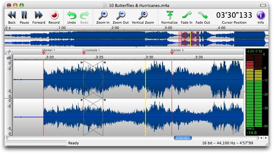 Recording. Open TwistedWave, press record. That is how easy it is to start recording a podcast, a song or a concert. While you are recording, place markers with a single key to remember places you will have to edit afterwards. It is truly a good tool for voice over artists.
